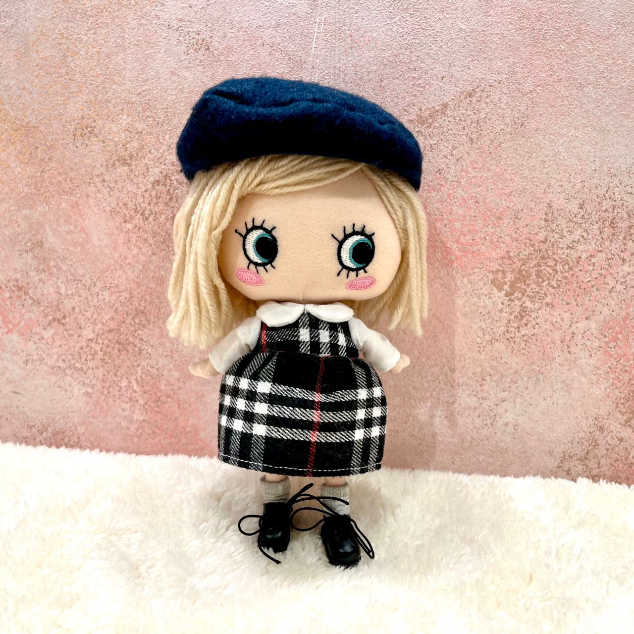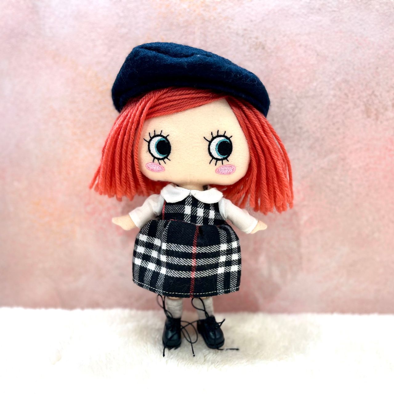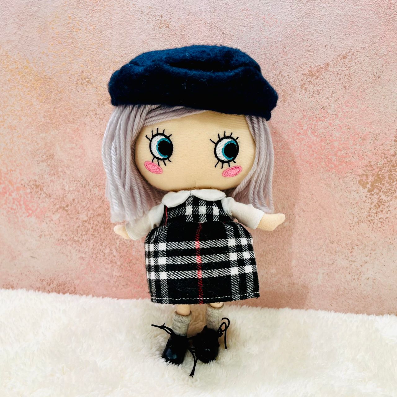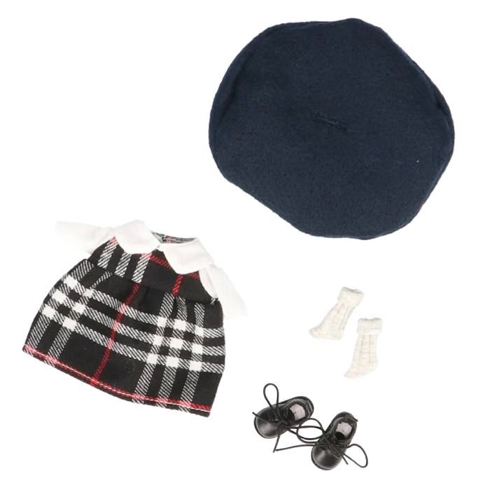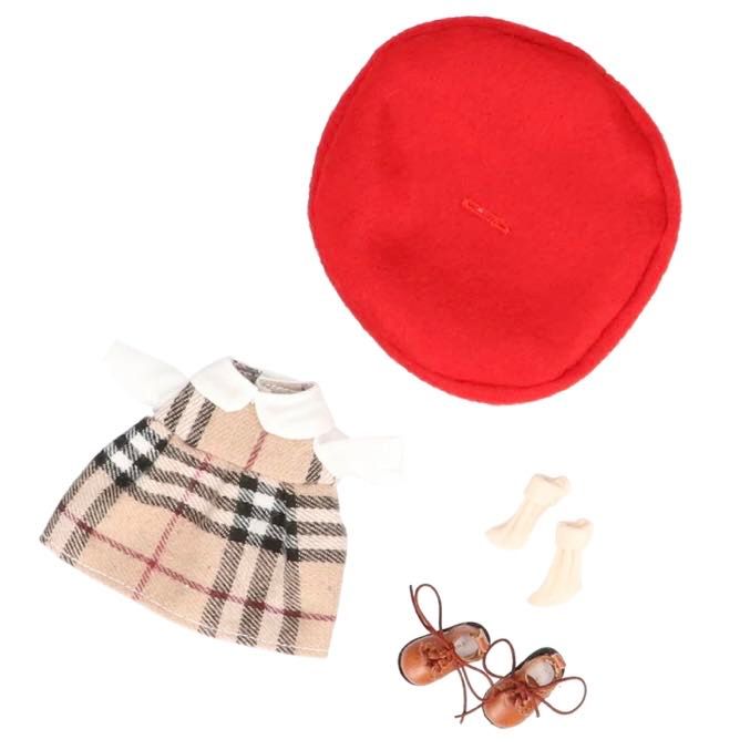 チェック柄の襟付きワンピースにベレー帽、さらにこちらは靴下とショートブーツまでセットになっております!この1セットで頭から足先まで全てのコーディネートアイテムが揃っちゃう!?