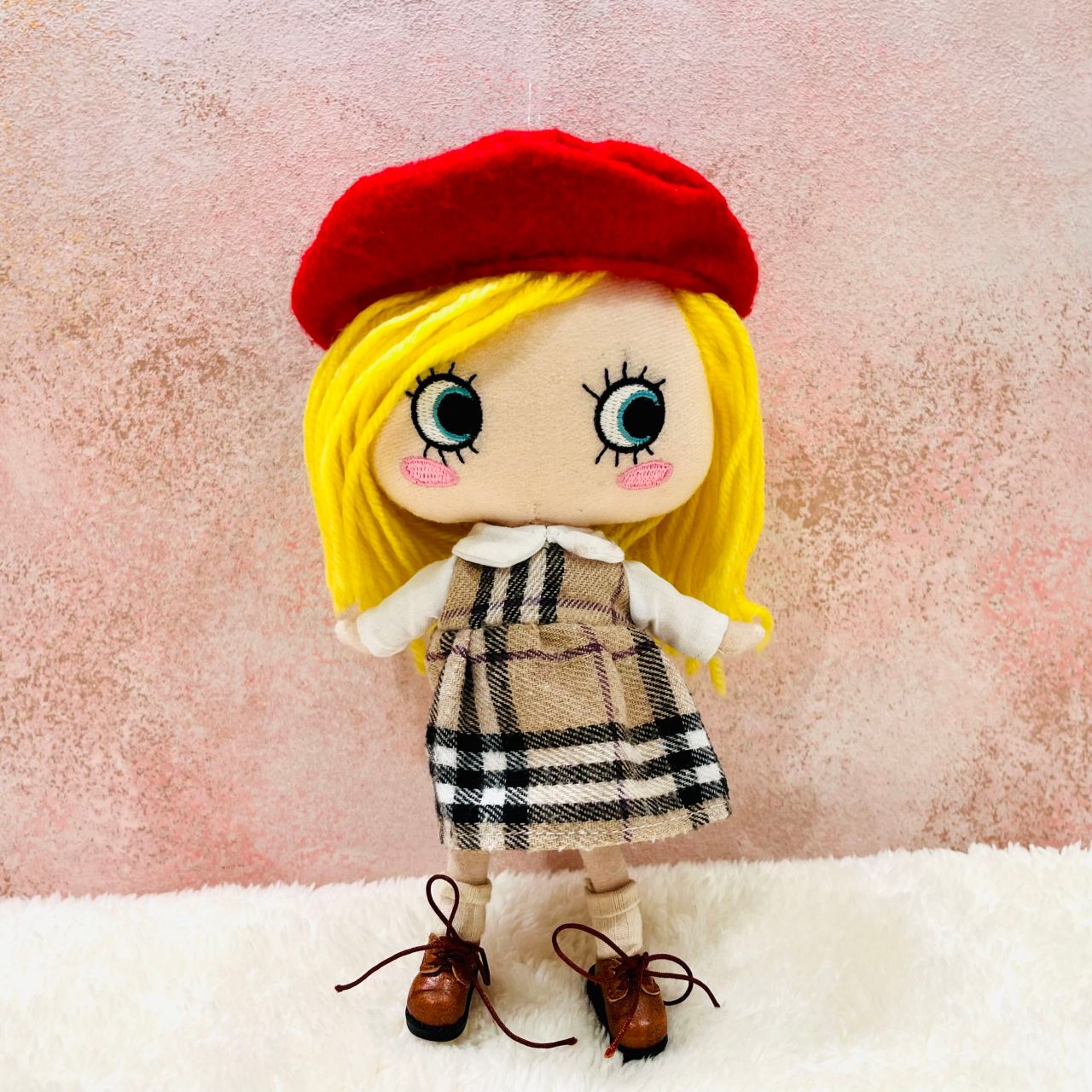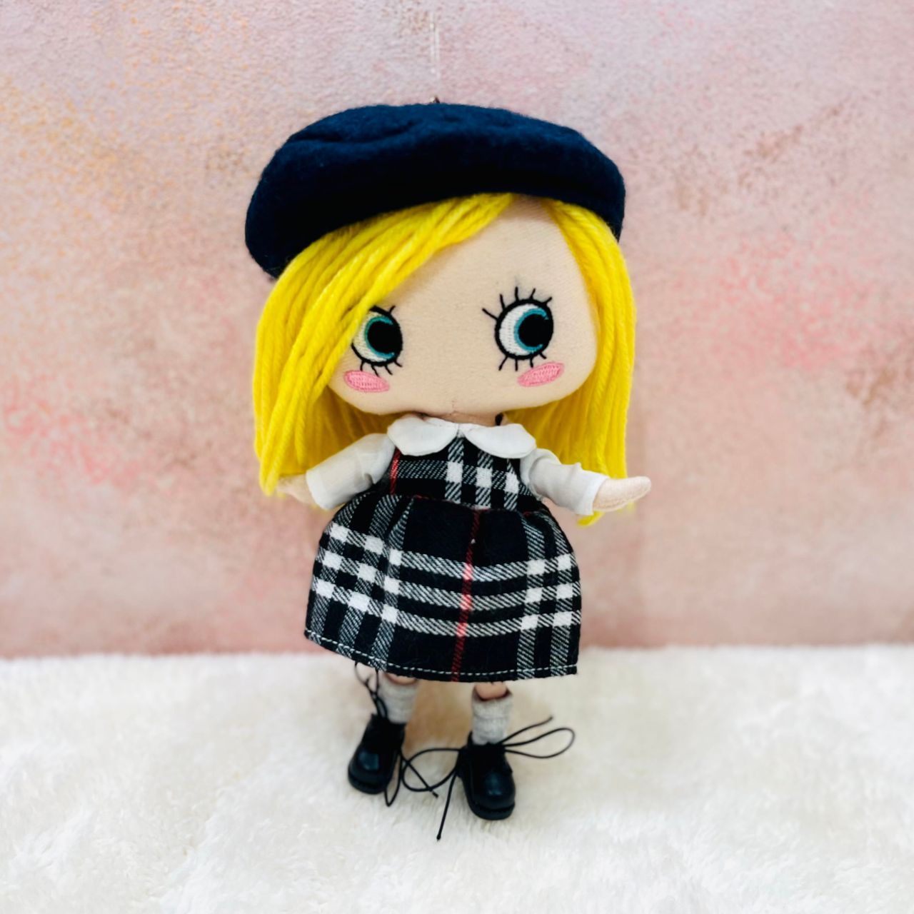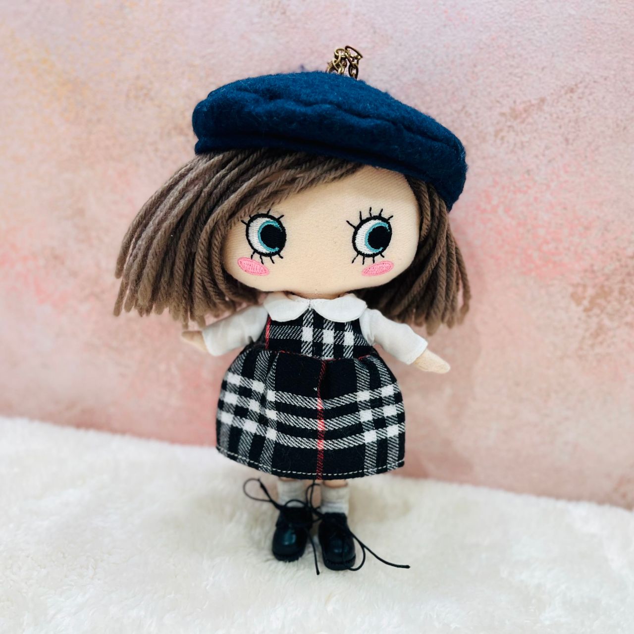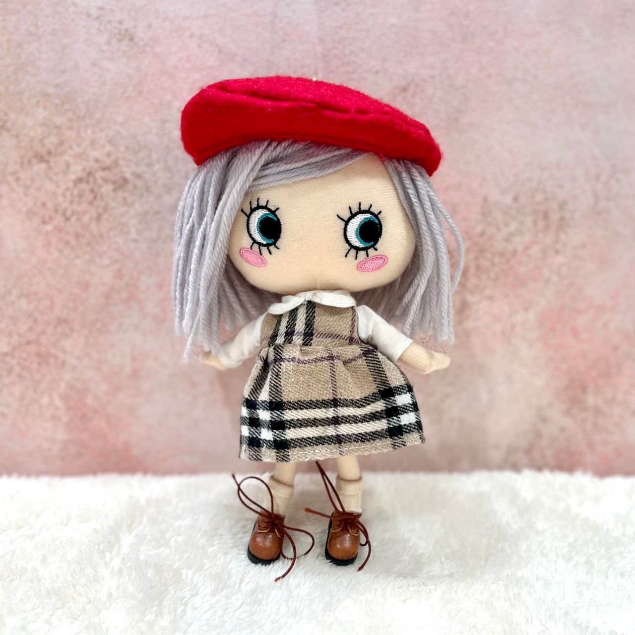 チェック柄の襟付きワンピースにベレー帽、さらにこちらは靴下とショートブーツまでセットになっております!この1セットで頭から足先まで全てのコーディネートアイテムが揃っちゃう!?