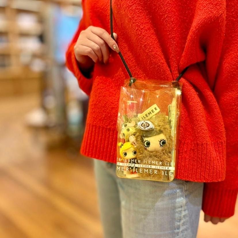 富子「そうなんです!私は店頭ポシェットとして使用!前の方にハピアニやminiフィギュア、サプライズハッピーチャームなどを入れてかわいく見えるようにし、後ろ側に電卓やメモなどを入れると仕事をしながらもイルメールを存分に楽しめちゃいます!カラーのあるクリアケースは珍しい気がしたのでせっかくならと好きなカラーのイエローにしました!」