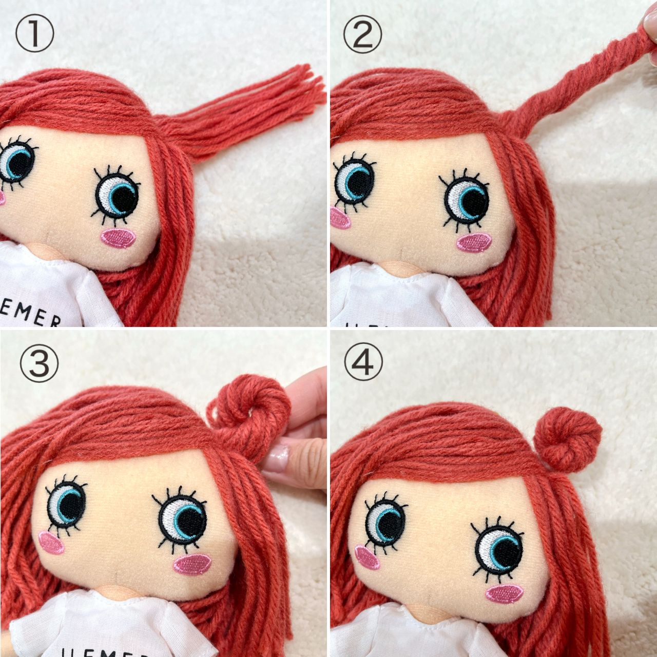 ①左右の頭上から10~15本ほど毛糸を取ります。