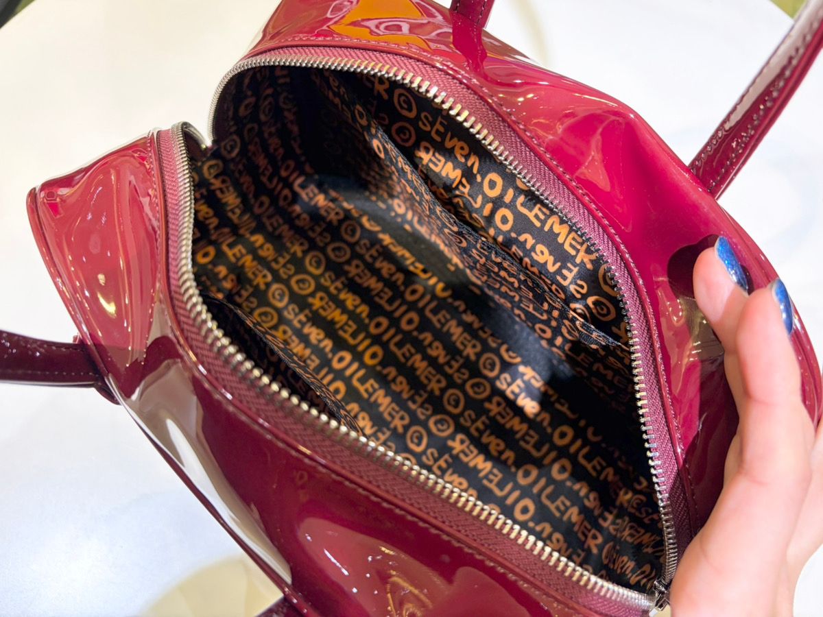 美しいボルドーカラーがバレンタインの贈り物にぴったり♡バッグの内装はデザイナーの名前がびっしり描かれたポップなデザイン♪
