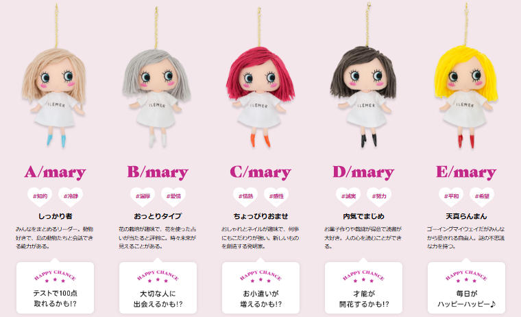 左からA/mary(エーマリー)、B/mary(ビーマリー)、C/mary(シーマリー)、D/mary(ディーマリー)、E/mary(イーマリー)