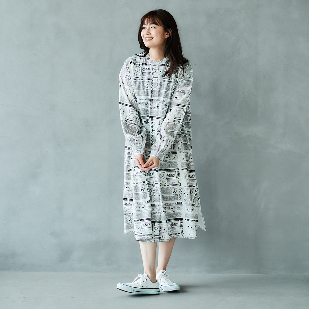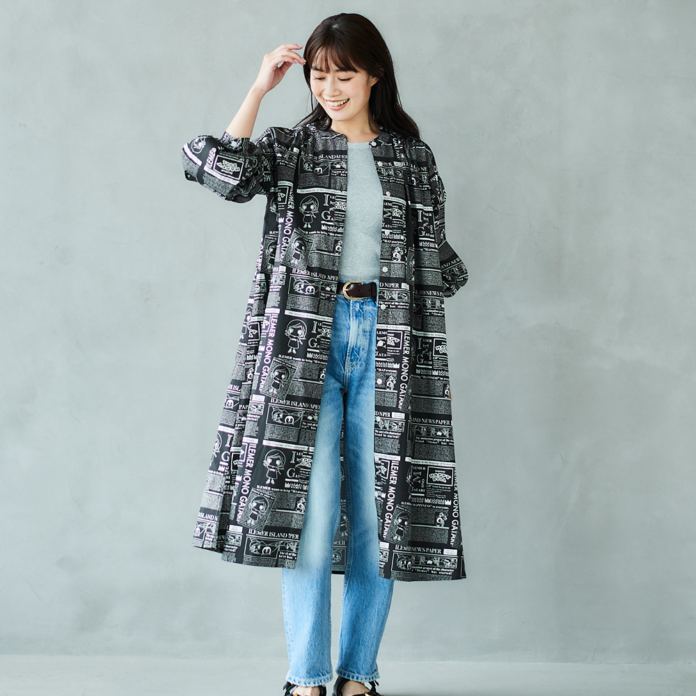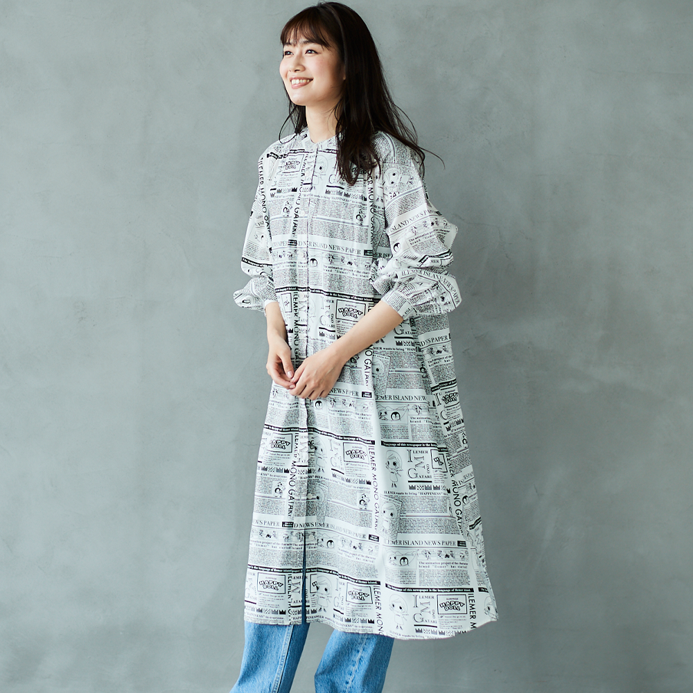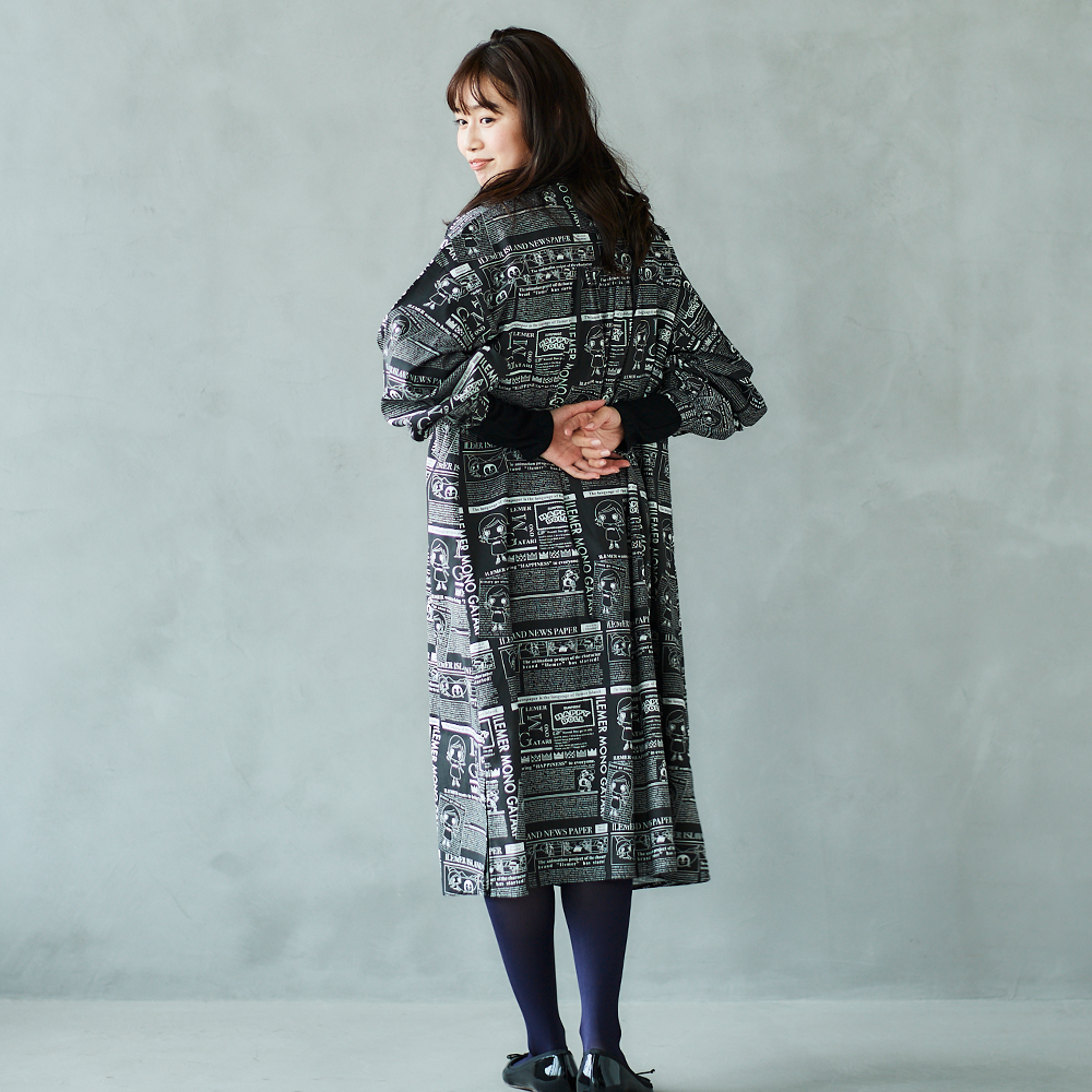 前回あっという間に売り切れてしまった、大人気ニュースペーパー柄の「羽織としても楽しめるワンピース」が、【襟なし】バージョンにリニューアルされて登場!