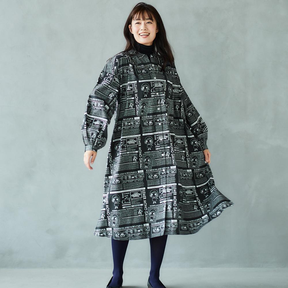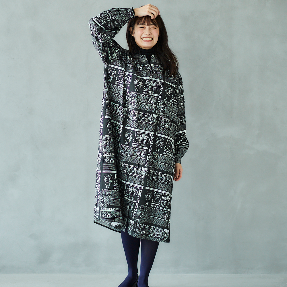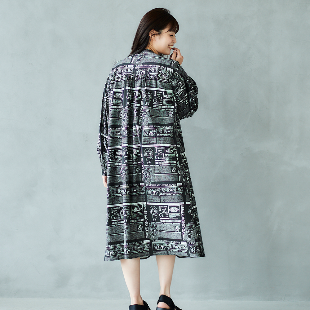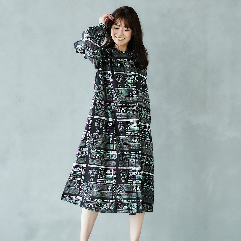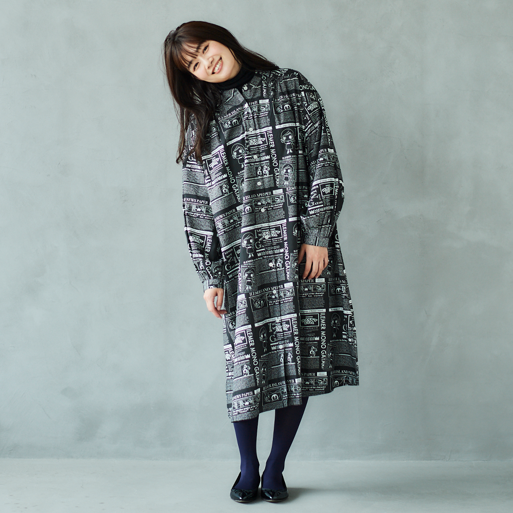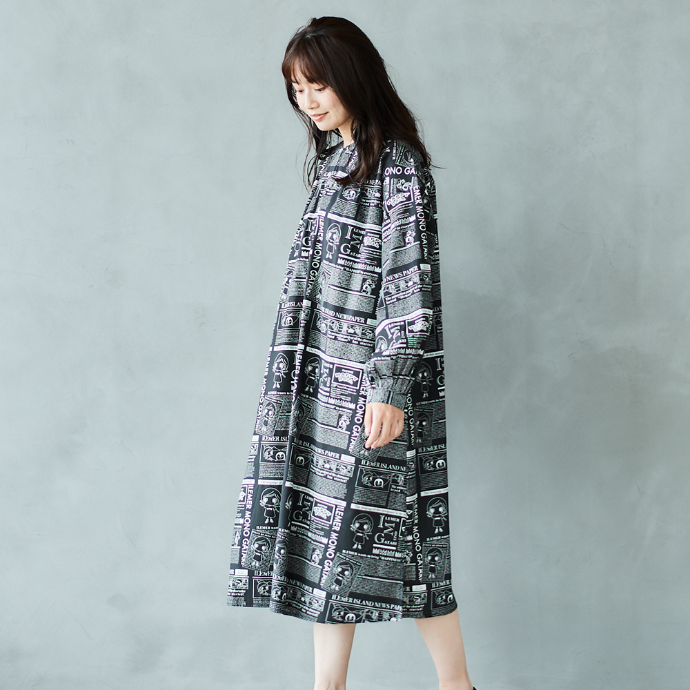 ニュースペーパ柄・ワンピース(襟なし)