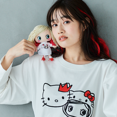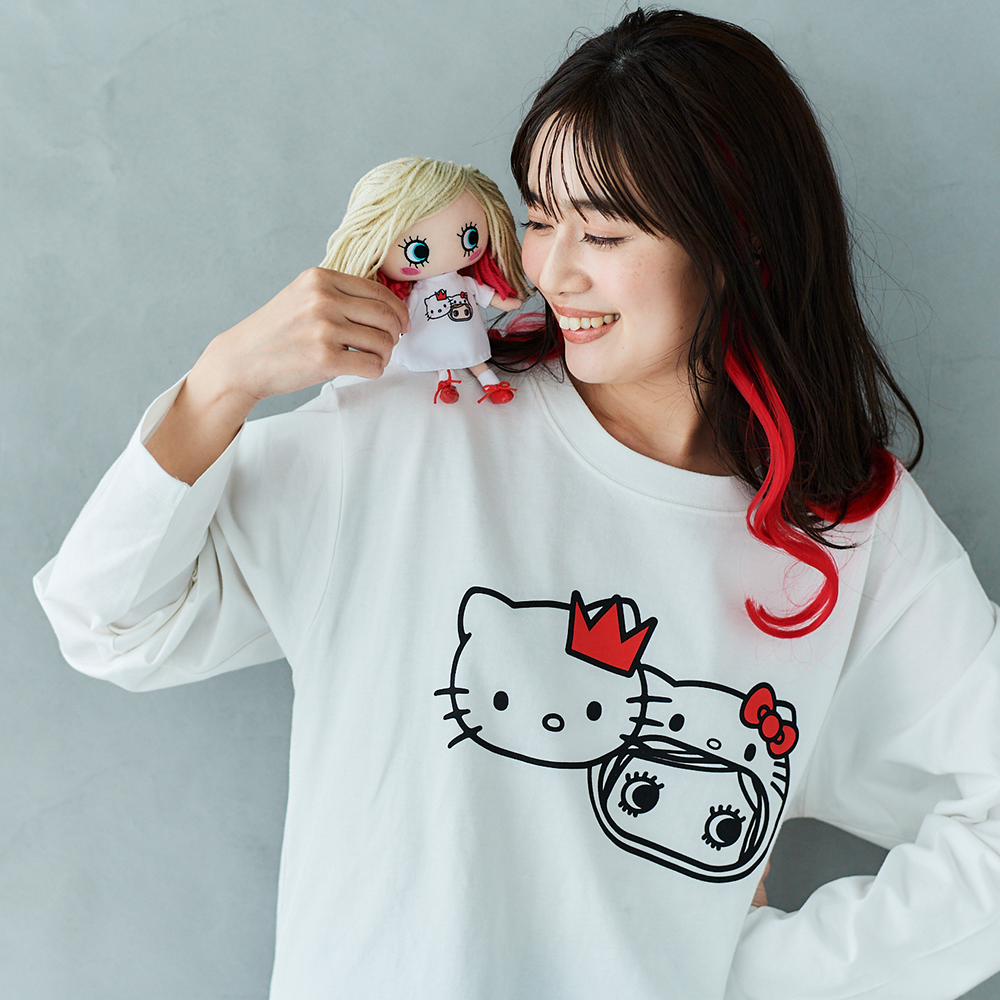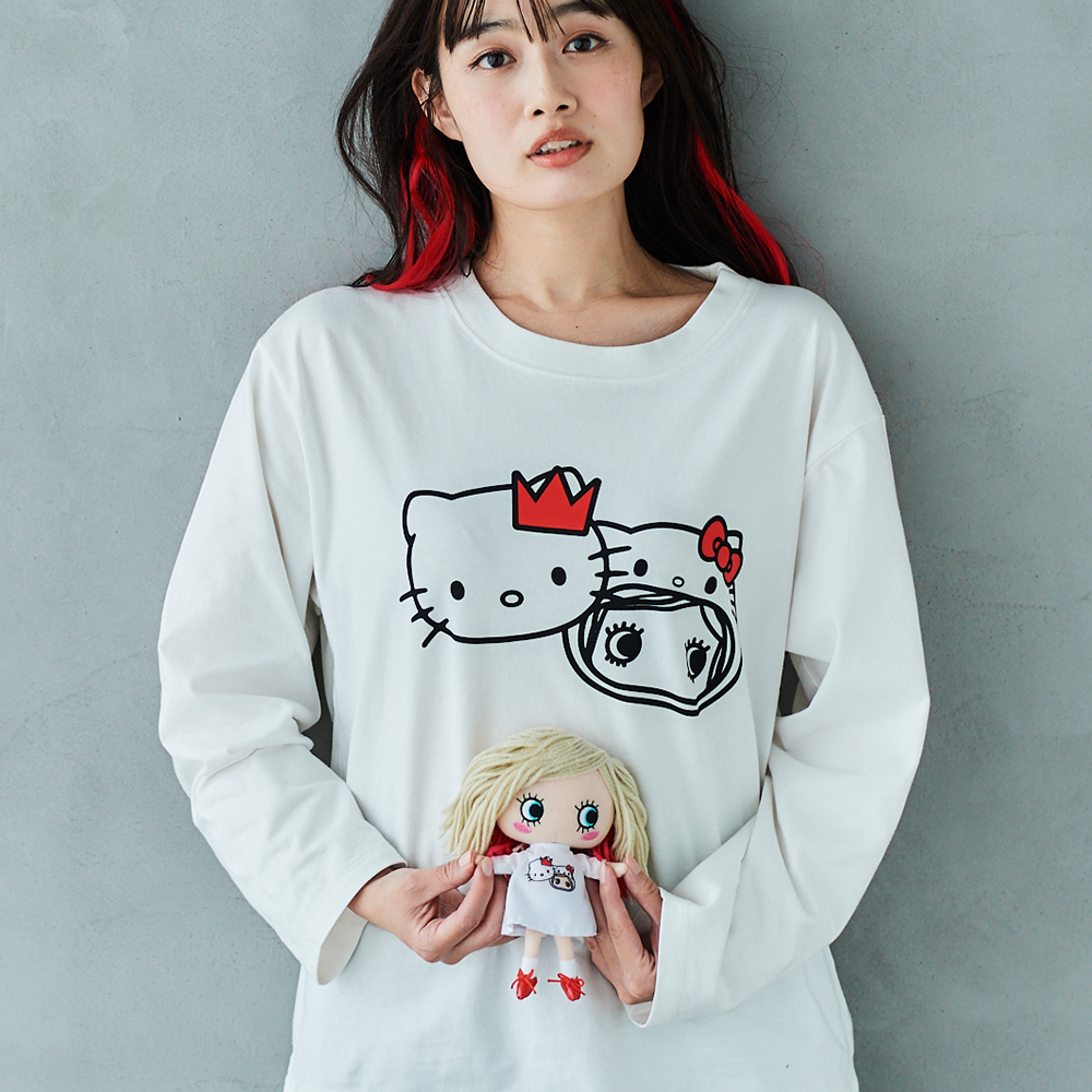 白いワンピースは少しハイネックで袖が少し眺めで大人なデザイン。大胆にプリントされたイーマリーとハローキティのお顔のデザインは、特別感たっぷり!!!!足元も赤いバレエシューズでとってもキュートなハッピードール♡♡♡これはゲットするしかありません。