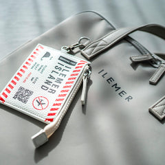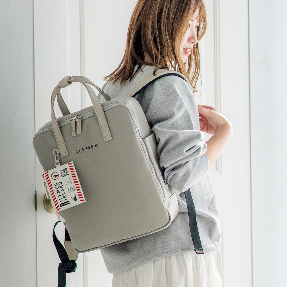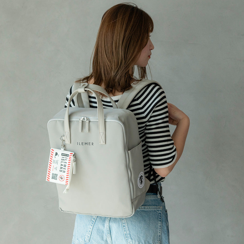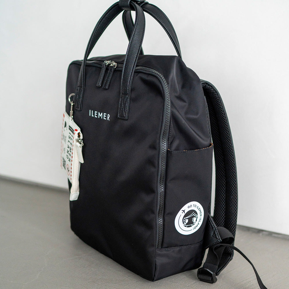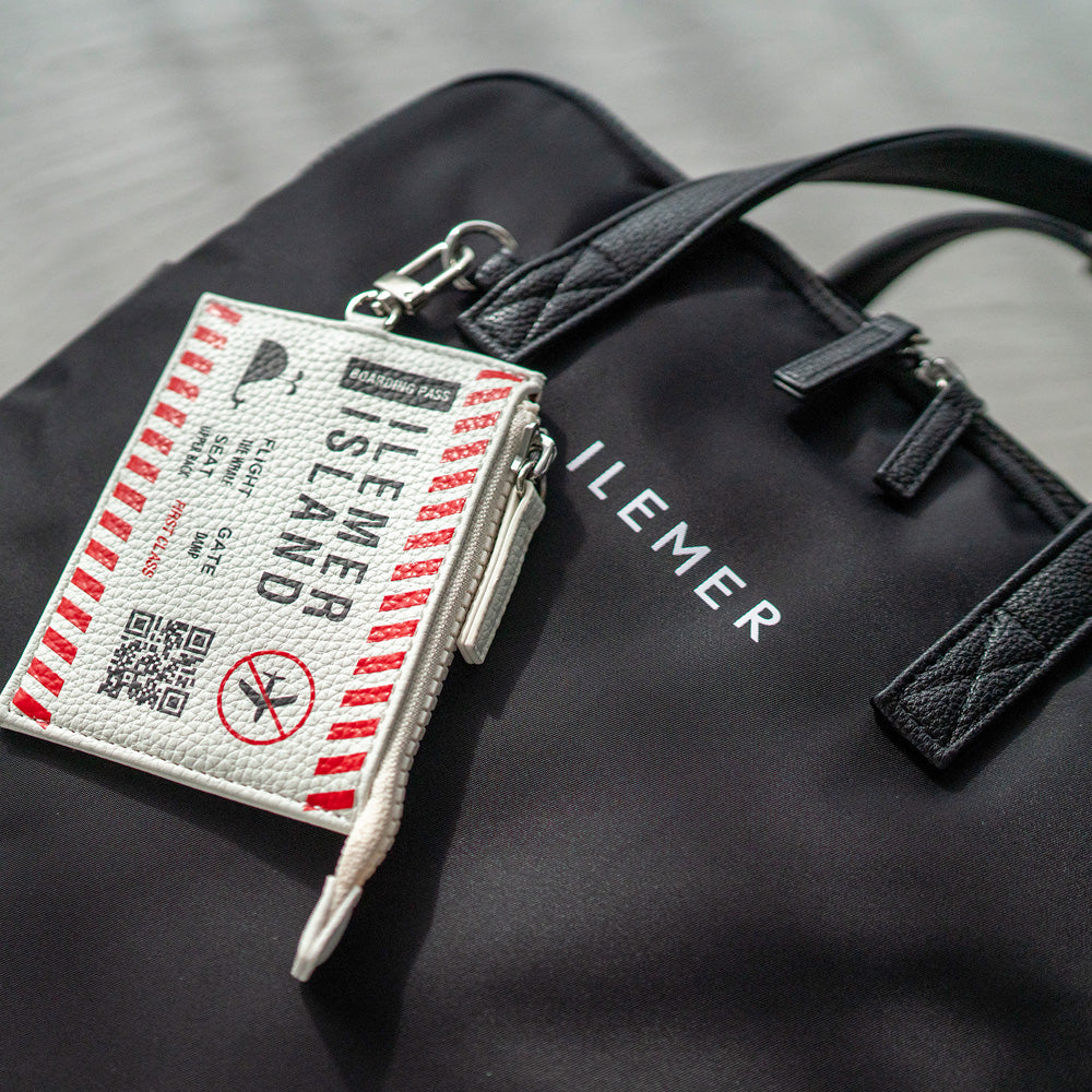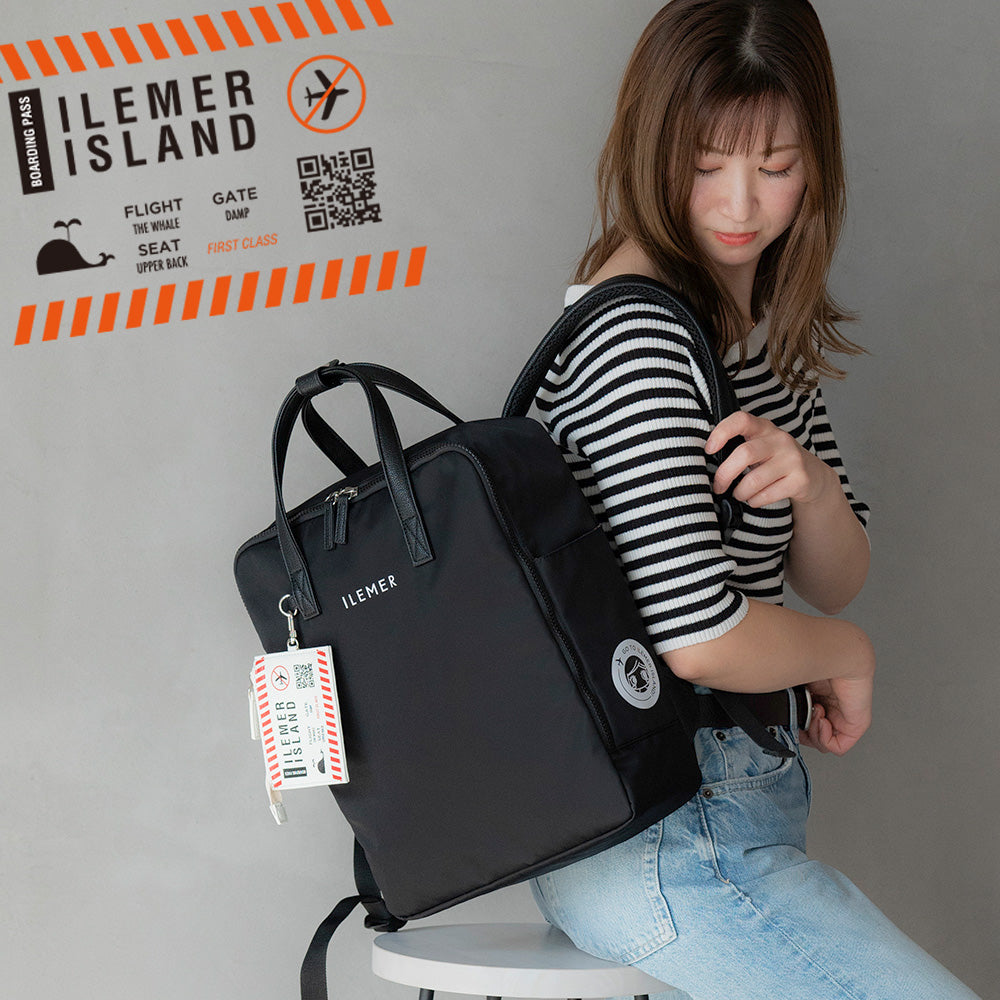 ボーディングチケットをモチーフにしたパスケースの行き先は、ILEMERのメインキャラクター"イーマリーちゃん"が住む不思議の島『ILEMER ISLAND』。リュックのサイドポケットにはイーマリーちゃんのキュートなお顔と、その周りをくるりと旋回する飛行機のオリジナルロゴ、そして"GO TO ILEMER ISLAND!"のメッセージが♪