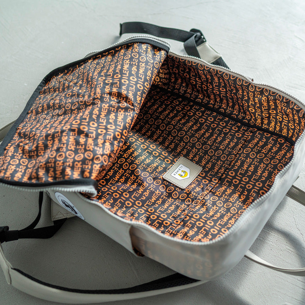 内装にはデザイナー自筆サインとブランドロゴのリピートパターンが一際お洒落なテキスタイルを採用。ゆったりとした大きめの内ポケットにはイーマリーちゃんのフェイスデザイン入りブランドタグがあしらわれています♪