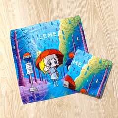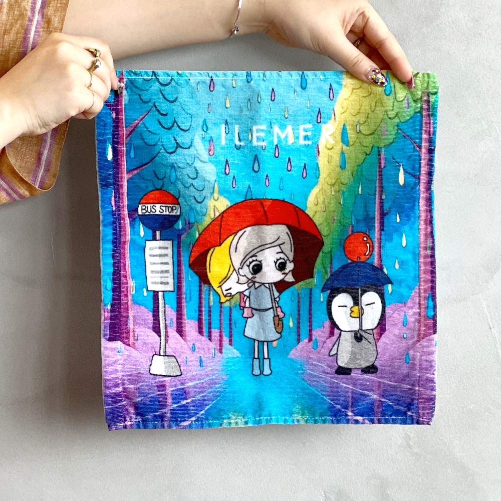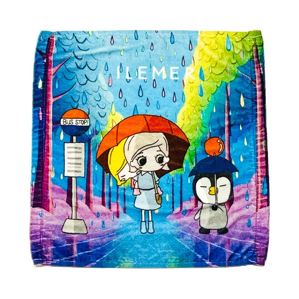 降り続く雨に濡れた地面に浮かぶ色とりどりの森林が幻想的でロマンティックな『イルメールミニタオル【雨の日】』が登場!